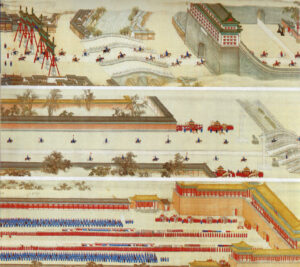 Titel: Kangxis Rückkehr nach einer Südtour im Jahr 1689. Zeitgenössische Abbildung.