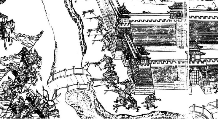Titel: Schlacht bei Liaoyang, 1621, Darstellung von 1635.
